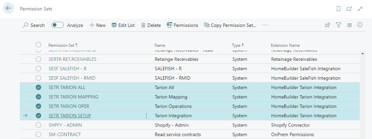 Open the page "Permission Sets" and make sure that the permission sets related to Tarion Integration have been added to the user that sets up the Job Queue as shown below.